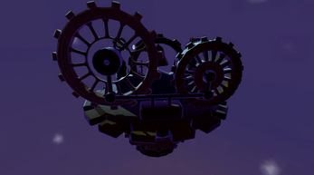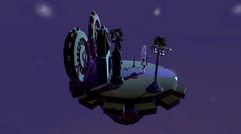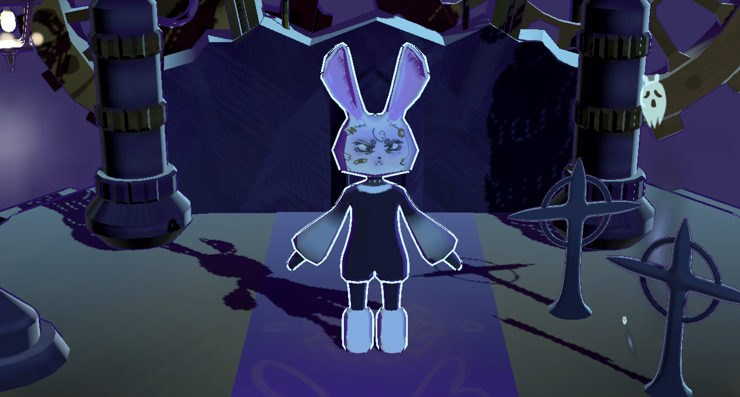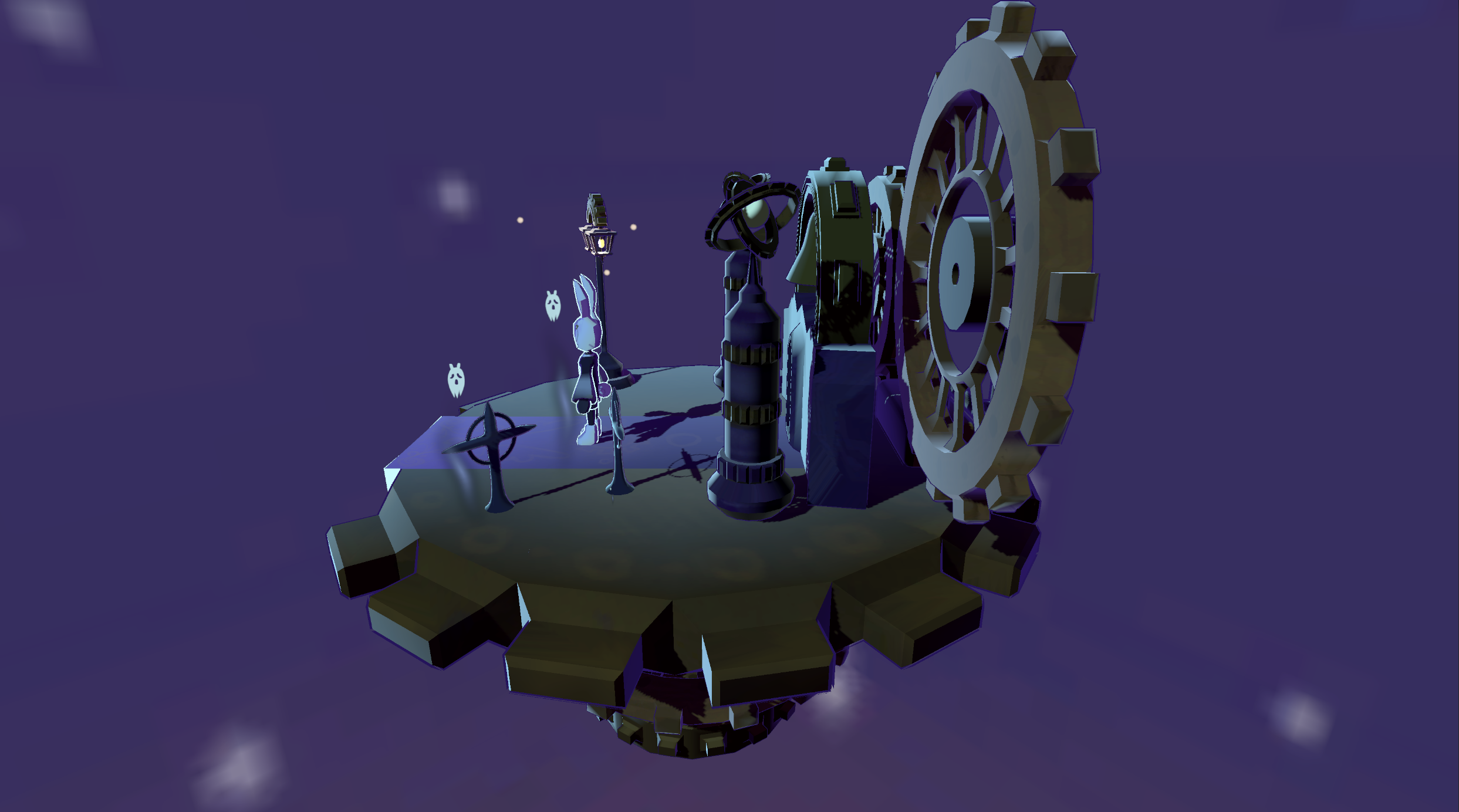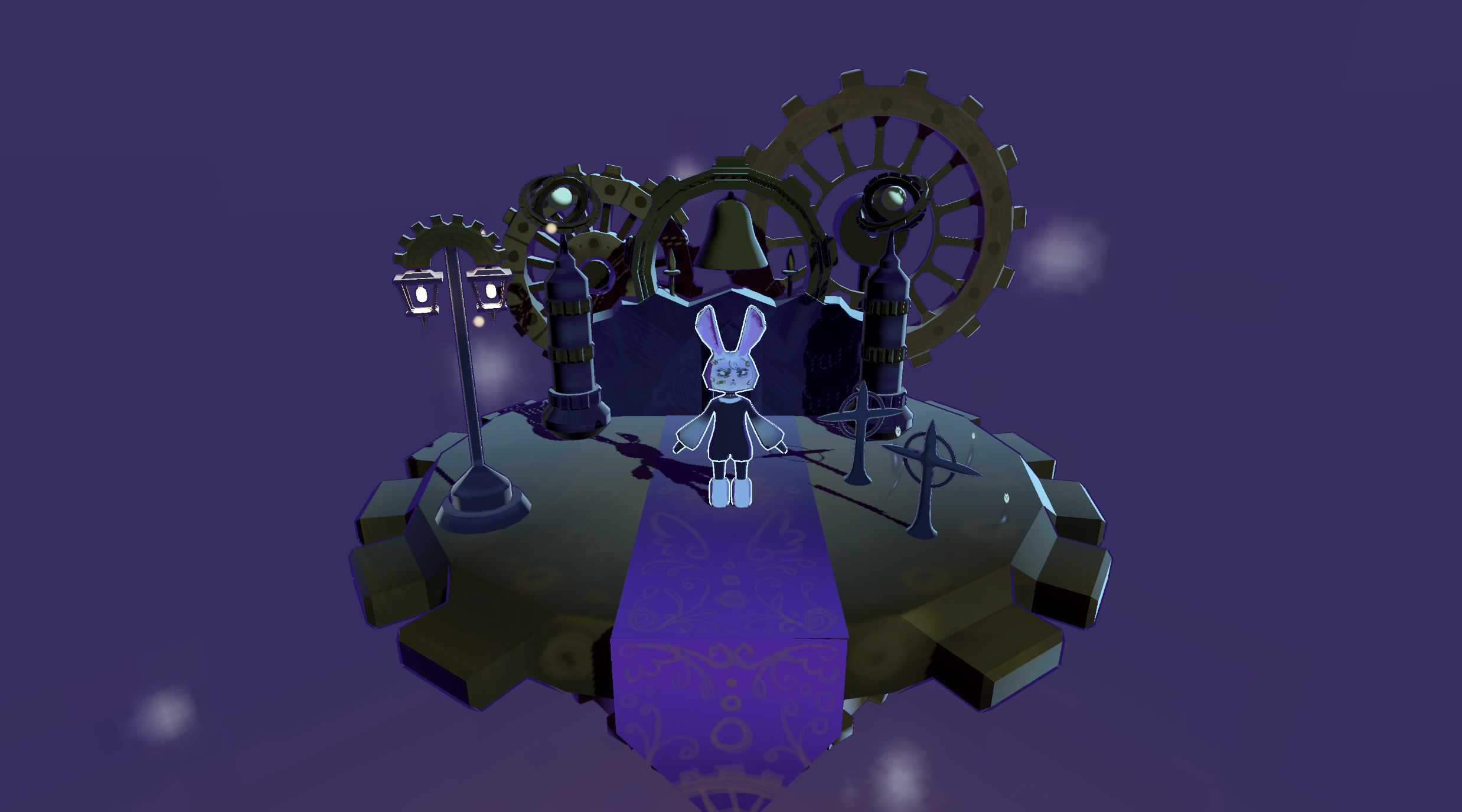 A spooky streampunk world with intense colorful lighting. And a courageous bunny, named Ebony, is exploring it.